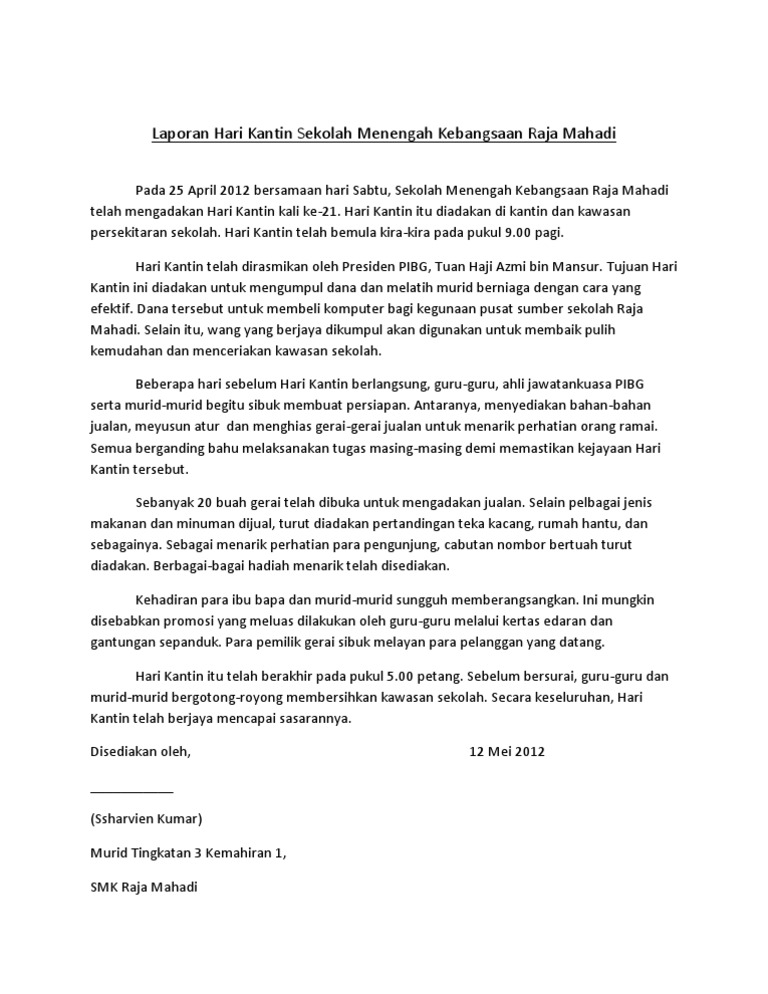 Dia akan bagi satu tajuk. Laporan Program Hari Kantin Sekolah Karangan Pecutan Akhir SPMSijil Pelajaran Malaysia. Check more flip ebooks related to contoh laporan program of.